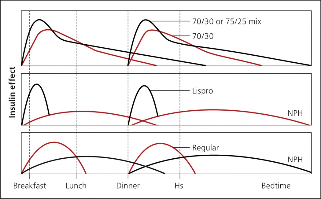 Hình 2. Dược động học của insulin hỗn hợp so với sử dụng 2 loại insulin (rapid acting + NPH hoặc regular + NPH)