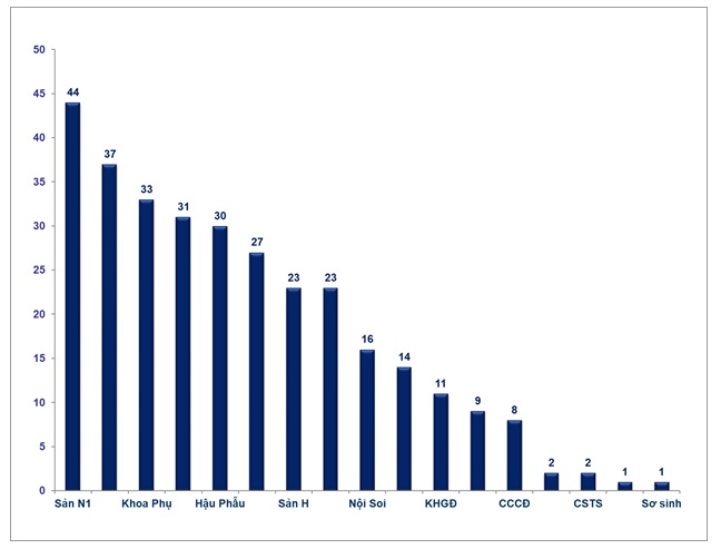 Số lượng báo cáo ADR của khoa Sản N1 cao nhất với 44 báo cáo chiếm tỷ lệ 12,8%, khoa Sản N2 với 37 báo cáo chiếm tỷ lệ 11,9%, khoa Phụ với 33 báo cáo chiếm tỷ lệ 10,6%. Khoa Sản N1 và Sản N2 là những khoa duy trì thực hiện tốt báo cáo ADR kịp thời trong 2 năm 2017 và 2018 nhằm cung cấp thông tin về các phản ứng có hại của thuốc về Trung tâm ADR Quốc Gia.