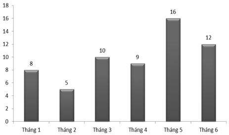 Số lượng báo cáo ADR phân bố đều trong các tháng, trung bình 10 báo cáo/tháng, tập trung nhiều hơn vào tháng 5 với 16 báo cáo chiếm tỷ lệ 26.7%. Số lượng báo cáo ADR nhận được ít nhất vào tháng 2 với 5 báo cáo chiếm tỷ lệ 8.3%