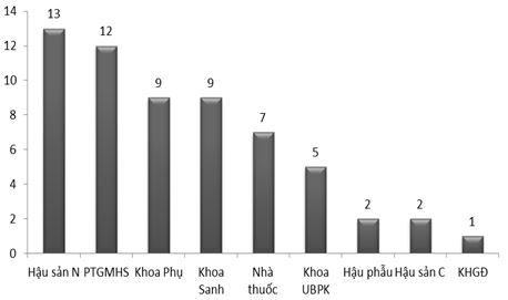 Số lượng báo cáo ADR từ khoa Hậu Sản N cao nhất với 13 báo cáo chiếm tỷ lệ 21.6%, tiếp theo là khoa PTGMHS với 12 báo cáo chiếm tỷ lệ 20%, khoa Phụ và khoa Sanh với 9 báo cáo chiếm tỷ lệ 15%.