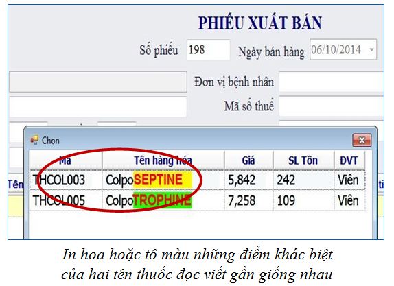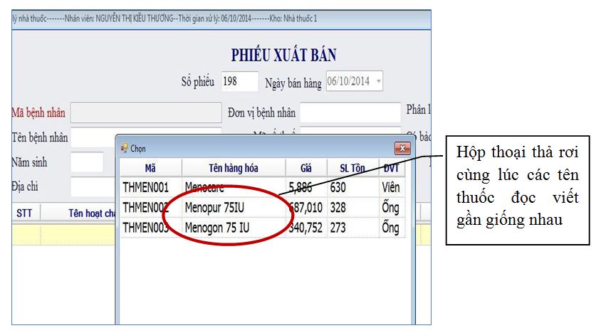 - Lỗi nhập dữ liệu vào máy tính (chọn sai tên thuốc từ hộp thoại thả rơi các tên thuốc đọc viết gần giống nhau đã được cài đặt trên phần mềm bảo quản và kê đơn thuốc).