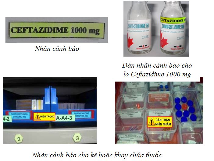 - Dán nhãn bên ngoài các tủ, kệ, khay chứa thuốc và dán ở vị trí dễ thấy. Dùng thêm nhãn cảnh báo cho những tủ, kệ, khay chứa thuốc có nguy cơ nhầm lẫn cao.