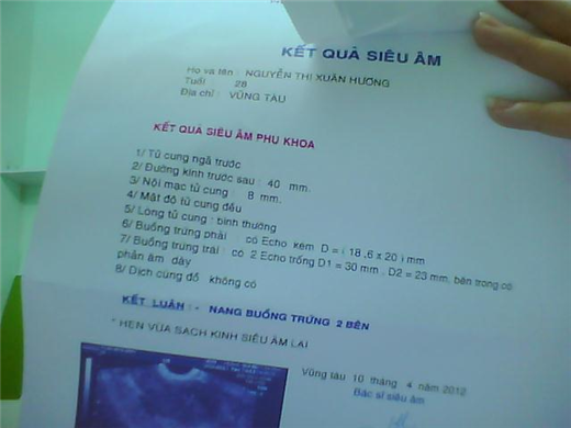 Cháu mới cưới được 3 tháng rồi , mà sao chưa có thai ,mặc dù tháng cuối cháu mua cả que rụng trứng để về canh đúng ngày mà vẫn ko đậu .Vợ chồng cháu đang rất mong mỏi .Cháu có QHTD trước hôn nhân ( khoảng 3 năm) nhưng chưa hề dùng thuốc gì cả (vì thời gian đó tránh thai bằng cách xuất ra ngoài).Hôm nay cháu đi khám phụ khoa ,bác sĩ nói cháu bị nang buồng trứng 2 bên,và nói nên đi Từ Dũ khám lại .Kết quả siêu âm của cháu xin gửi lên để bs xem xét cho cháu lời khuyên ,và có thể nói rõ bệnh tình thể hiện trên đó 1 cách cụ thể hơn .Kết quả này có nguy hiểm không bs .vợ chồng cháu muốn lên khám thì khám ở đ/c nào ? nên khám & xét nghiệm gì ?và giá khoảng bao nhiêu ạ ? Cháu cám ơn bs .Mong nhận được phản hồi của bác sĩ .