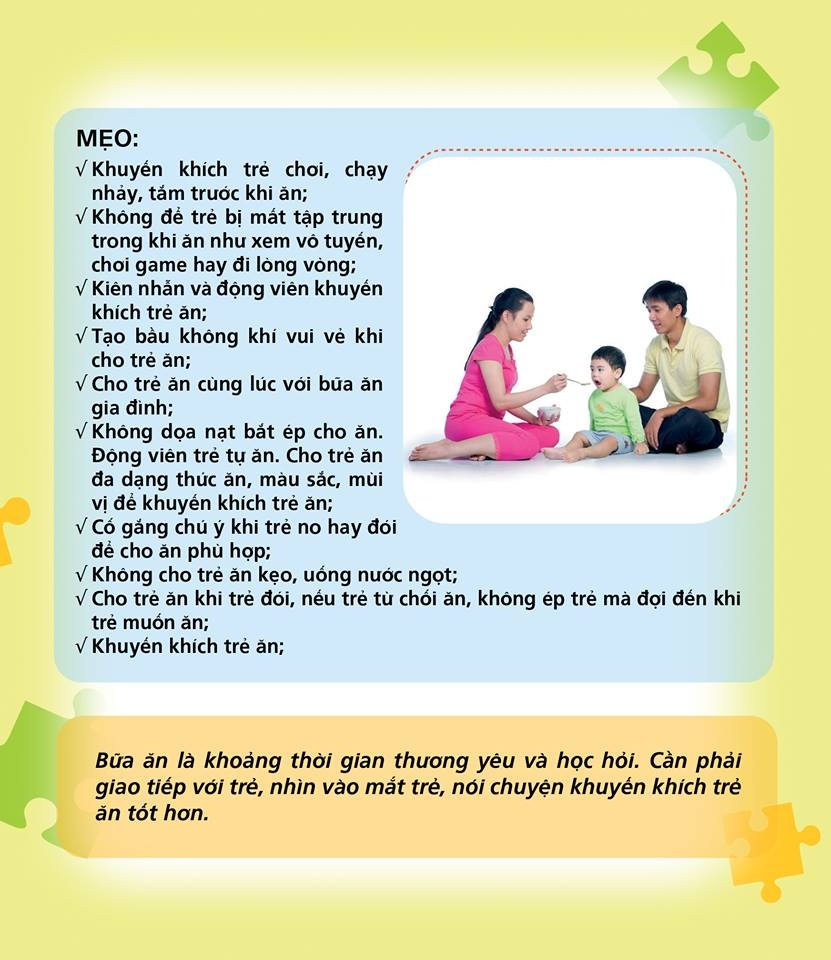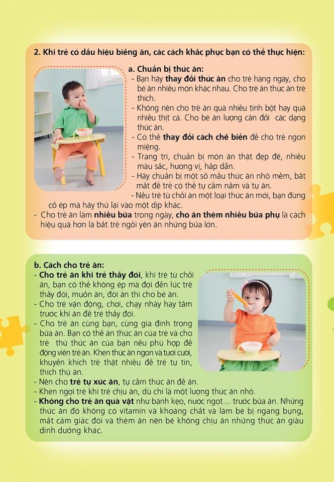Trẻ nhỏ đôi khi có biểu hiện biếng ăn và kén ăn. Thực tế có khoảng 25% đến 35% trẻ ở lứa tuổi chập chững biết đi và lứa tuổi mẫu giáo được cha mẹ cho là kén ăn hoặc khảnh ăn. Tuy nhiên, đa số những trẻ này đều có cảm giác ngon miệng phù hợp với lứa tuổi và đều phát triển bình thường. Vì vậy cần giúp gia đình và người chăm sóc trẻ thực hành cho trẻ ăn hiệu quả.