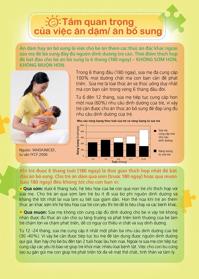 Từ 6 tháng tuổi trở đi, mặc dù sữa mẹ vẫn đóng vai trò rất quan trọng cung cấp năng lượng và các chất dinh dưỡng cho trẻ, nhưng không thể đáp ứng đủ tổng mức năng lượng cần cho sự phát triển của trẻ, vì vậy ngoài sữa mẹ cần cho trẻ ăn bổ sung.