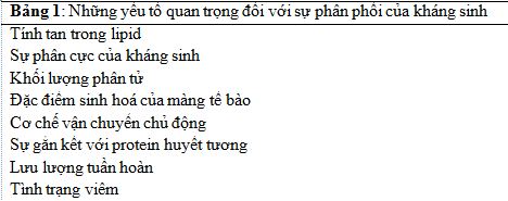 Có nhiều yếu tố điều hòa ảnh hưởng đến sự phân phối đến mô của kháng sinh, những yếu tố này được mô tả trong Bảng 1. Phần lớn các thuốc, trong đó có kháng sinh, cần được vận chuyển từ máu đến vị trí mô mục tiêu mới có thể có tác dụng. Một khi thuốc đi vào hệ tuần hoàn, thuốc dễ dàng đi qua màng tế bào để đến mô bằng cách khuyếch tán chủ động hoặc thụ động.