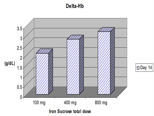Gravier và cộng sự cho thấy Hb tăng 3,8g/dl sau 14 ngày (với tổng liều được chỉ định là 400-600mg) và sự khác biệt về thời gian đạt Hb mục tiêu của sắt truyền là 14 ngày so với sắt đường uống là 30 ngày. Hai nghiên cứu khác cho thấy rằng sắt sucrose là tốt hơn sắt đường uống khi đo nồng độ Hb vào ngày thứ 7 và có phụ thuộc liều sử dụng.