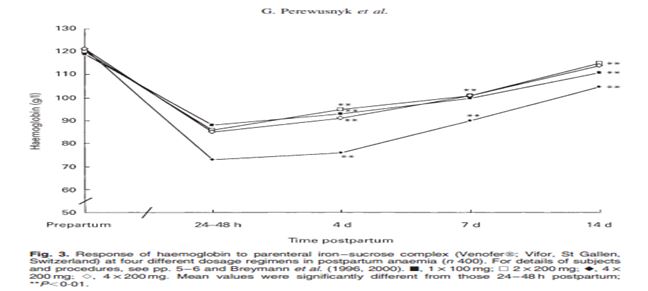 Broche và cộng sự phân tích dữ liệu của 4292 sản phụ trong khoảng thời gian từ giữa tháng 4 năm 2001 đến tháng 3 năm 2003. Tất cả các sản phụ đều có dấu hiệu thiếu máu (Hb 8g/dl) trong vòng 48 giờ sau sinh (n=217, chiếm 5% của nhóm nghiên cứu) .Các phân tích bao gồm thăm khám lâm sàng và kết quả xét nghiệm. Từ tháng 4 năm 2001 đến năm 2002, 103 bệnh nhân được truyền máu (n=15 [14,6%]) hoặc uống viên sắt (n=88) với liều trung bình là 100-200mg sắt nguyên tố/ngày, trong khi đó từ tháng 4 năm 2002 đến 2003, 114 bệnh nhân được truyền máu (n=5 [4,4%] ), hoặc uống viên sắt (n=66), hoặc truyền sắt sucrose đường tĩnh mạch (n=43). Tổng liều sắt sucrose truyền tĩnh mạch trung bình là 359 mg (trong khoảng 200-600 mg) được tính theo công thức: Tổng số sắt truyền [mg] = trọng lượng cơ thể [kg] x 2,4 x [Hb đích - Hb thực tế] g/dl. Trong 7 ngày, sự gia tăng trung bình Hb là 0,8 g/dl cho viên sắt uống, 3,5 g/dl cho truyền máu và 1,9 g/dl cho sắt sucrose truyền tĩnh mạch. Hb trung bình 7 ngày ở những bệnh nhân được chỉ định sắt sucrose truyền tĩnh mạch cao hơn đáng kể so với những người uống viên sắt do sắt sucrose được dung nạp tốt hơn sắt đường uống.