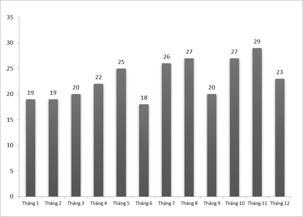 Số lượng báo cáo ADR phân bố tương đối đều giữa các tháng, trung bình 23 báo cáo/tháng, cao hơn năm 2016 (20 báo cáo/tháng), tập trung nhiều hơn vào tháng 11 với 29 báo cáo chiếm tỷ lệ 10,5%. Số lượng báo cáo ADR nhận được ít nhất vào tháng 6 với 18 báo cáo chiếm tỷ lệ 6,5%.