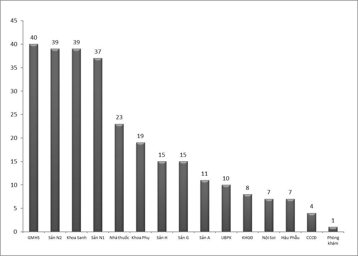 Số lượng báo cáo ADR từ khoa GMHS cao nhất với 40 báo cáo chiếm tỷ lệ 14,5%, tiếp theo là khoa Sản N2 và Khoa Sanh với 39 báo cáo chiếm tỷ lệ 14,2%, Khoa Sản N1 với 23 báo cáo chiếm tỷ lệ 8,4%. Đây là các Khoa thực hiện tốt việc báo cáo ADR kịp thời nhằm cung cấp thông tin về các phản ứng có hại của thuốc về Trung tâm ADR Quốc Gia.