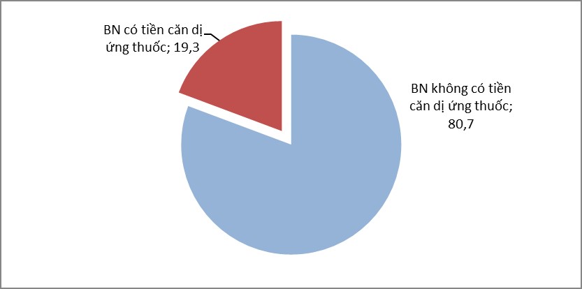 Số báo cáo ADR trên bệnh nhân không có tiền căn dị ứng thuốc là 222 báo cáo chiếm tỷ lệ 80,7%, tăng so với năm 2016 (tăng 18%). Số báo cáo ADR trên bệnh nhân có tiền căn dị ứng thuốc là 53 báo cáo chiếm tỷ lệ 19,3%, giảm so với năm 2016 (giảm 10%). Điều này thể hiện sự thận trọng của nhân viên y tế đối với những bệnh nhân có tiền căn dị ứng thuốc nên tỷ lệ xảy ra ADR trên nhóm bệnh nhân này giảm so với năm 2016.
